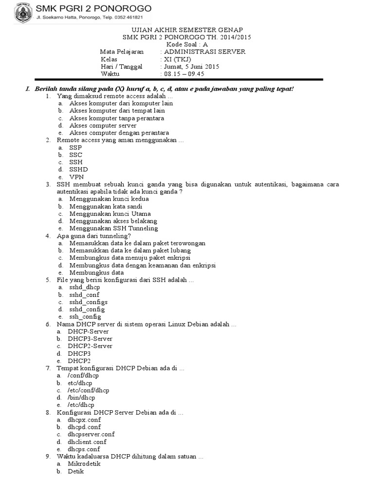 40 soal tentang seo & jawabannya (pilihan ganda + essay) 50 soal pilihan ganda (blog dan internet) + kunci jawaban. Jenis/teknik penilaian aspek yang dinilai jenis/teknik penilaian instrumen pengetahuan tes pilihan ganda soal tes pilihan ganda (terlampir) keterampilan tes kinerja praktikum dengan packet 0 response to soal pilihan ganda tkj (proxy server dan jawaban) post a comment. Dalam sebuah jaringan yang besar, akan ada bagian yang pengalamatan ip address tidak begitu kritikal. Server yang dapat membuat sistem berbasis unix (seperti linux) untuk melakukan sharing rresource dengan sistem berbasis